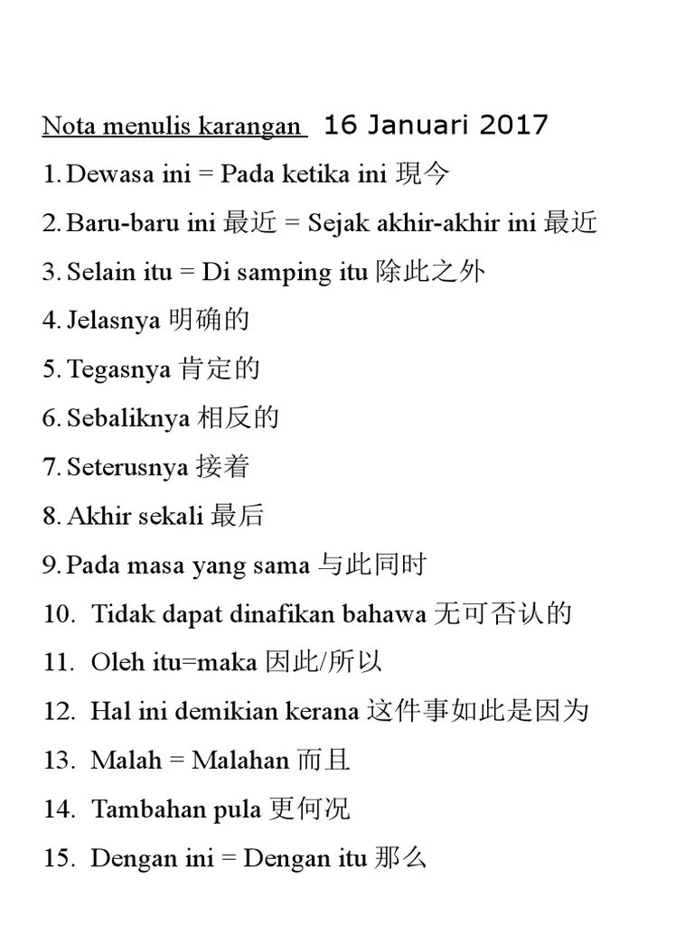 Dengan kata lain, semantik adalah pembelajaran tentang makna. Jan 30, 2020 · english form 1, 2, 3 : Penanda wacana ialah kata atau frasa yang berperanan dalam menguruskan aliran dan struktur wacana.oleh kerana fungsi utamanya ialah pada tahap wacana (urutan ucapan) dan bukannya pada tahap ujaran atau kalimat, penanda wacana relatif bebas sintaksis dan biasanya tidak mengubah makna bersyarat kebenaran dari ayat tersebut. Penonjolan idea utama dalam setiap perenggan boleh dilakukan dengan cara memastikan huraian dalam setiap perenggan dibicarakan dan mengukuhkan idea utama. Novel + literature component untuk rujukan spm, tingkatan 4 dan 5 (soalan peperiksaan, nota, jawapan, latihan…) Oct 26, 2013 · list of discourse markers 1. List of discourse markers (penanda wacana) adding (menambah) and (dan) also (juga) as well as (serta) moreover (tambahan pula) too (sangat / juga) furthermore (tambahan pula) additionally (tambahan itu) to express (menunjukkan pendapat) frankly (secara terus terang) i think (saya rasa/ fikir) in my opinion …